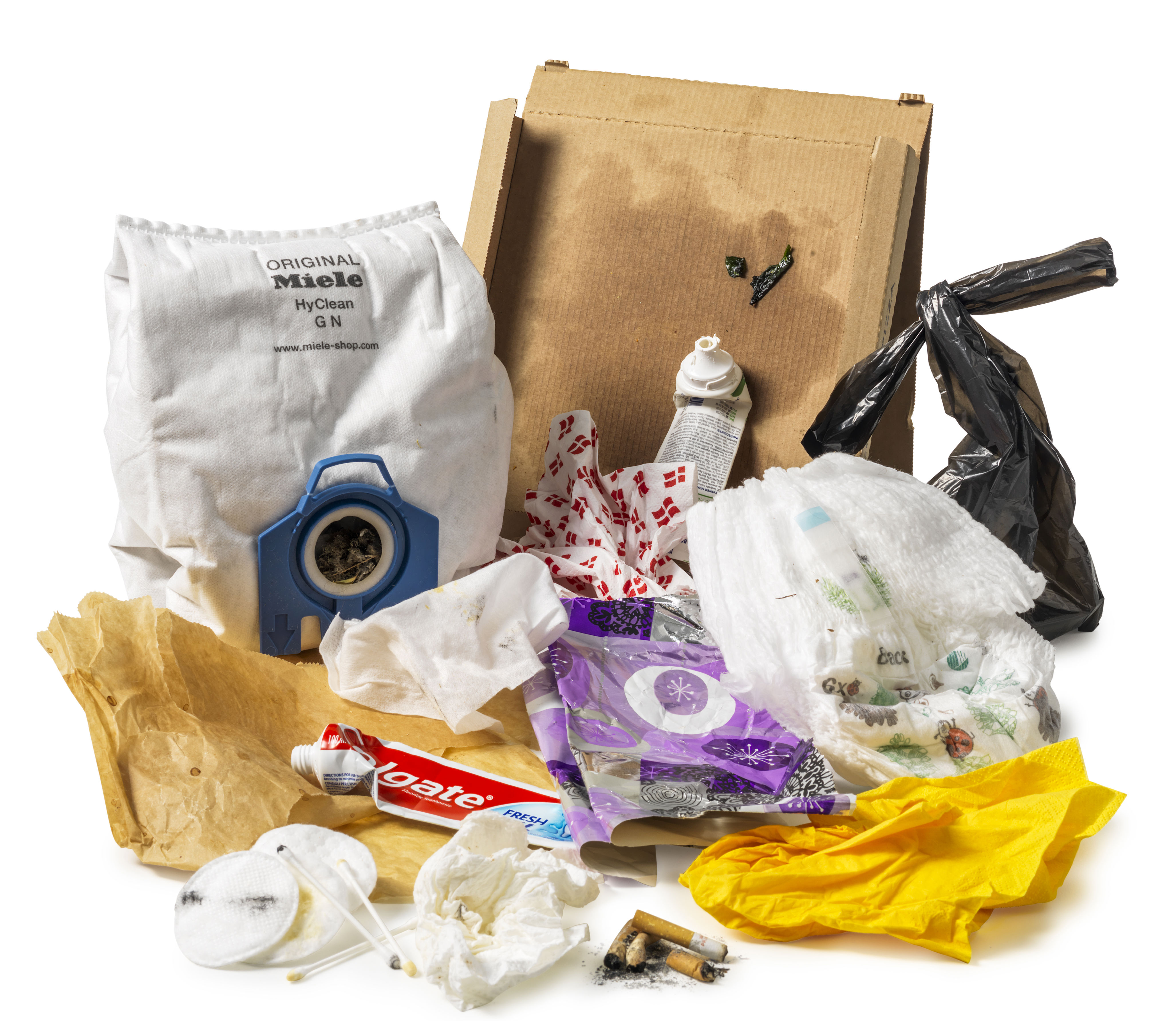 Restaffaldet er typisk fyldte støvsugerposer, chips- og kaffeposer, brugte bind og bleer, cigaretskod, opfej, vatpinde og vatrondeller fra badeværelset og lignende. Husk at batterier og kemikalier skal sorteres fra og afleveres som miljøfarligt affald. Med den lille nemme sorteringsguide til køleskabet får du hurtigt et overblik over, hvad der skal i hvilken skraldespand. Den kan være en fin hjælp til alle i husstanden.