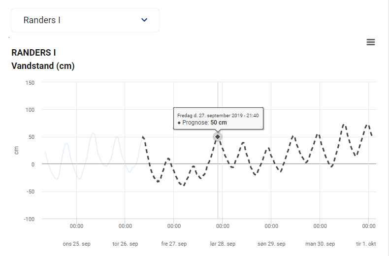 Vælg "Vandstand" og på kortet vælges f.eks. Randers eller Udbyhøj. I grafen derunder vises både den målte vandstand samt prognosen for de næste 5 dage. Se eksempel: