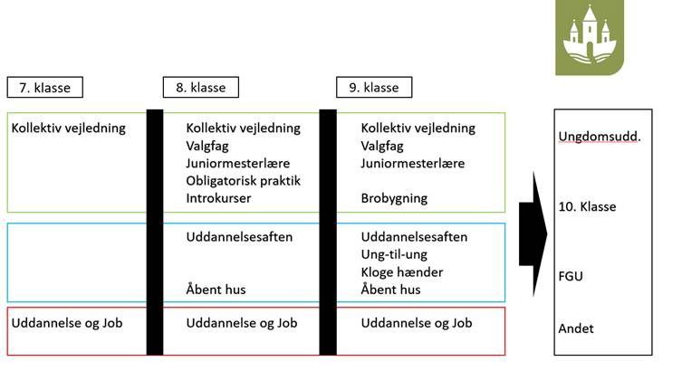 Ovenstående principper kommer til udtryk i planlægningen af aktiviteter i udskolingen fra 7.-10. klasse og fremgår af nedenstående figur 1.