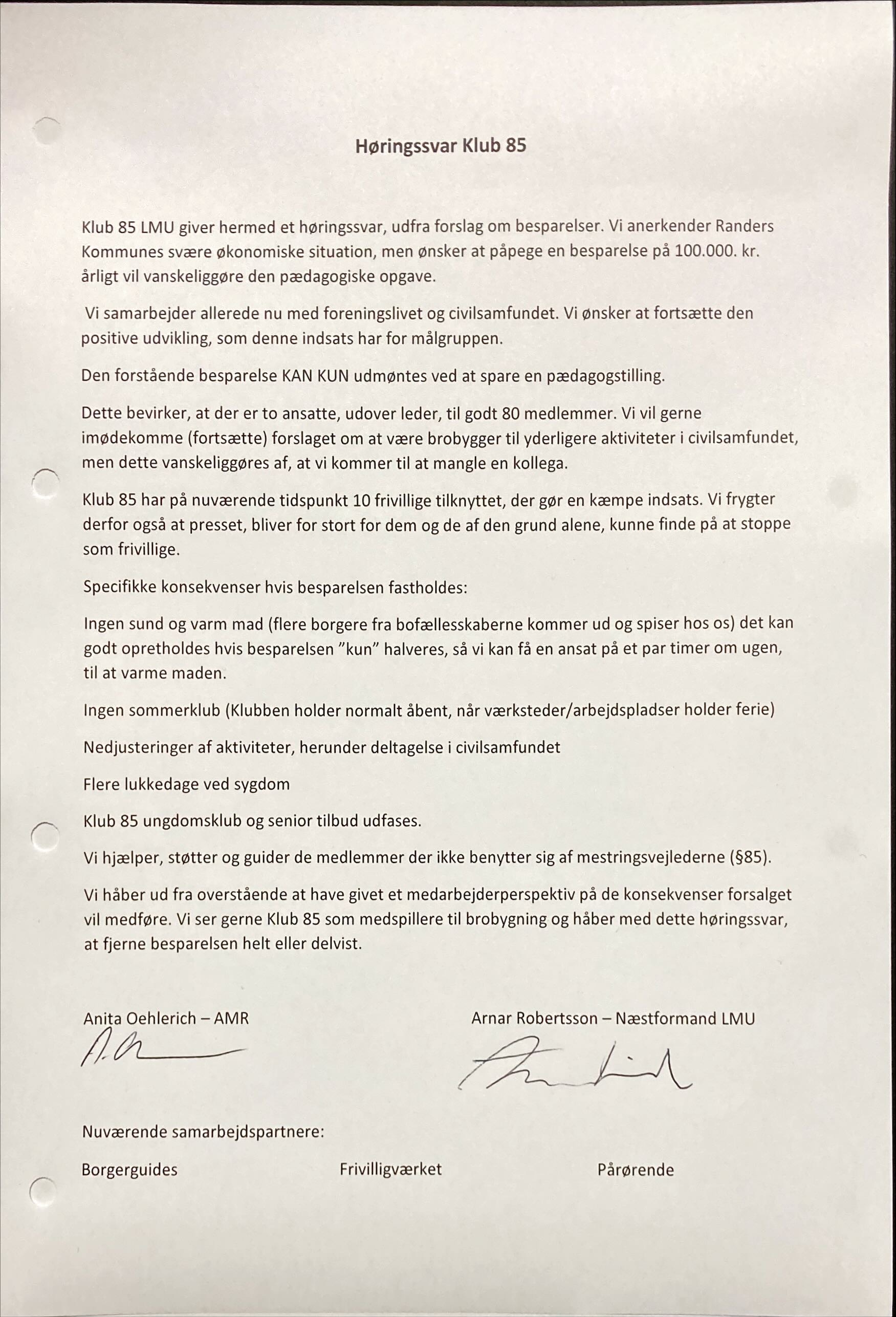 Høringssvar imod besparelser på 10,5 millioner kr. på Trekløverskolen.
