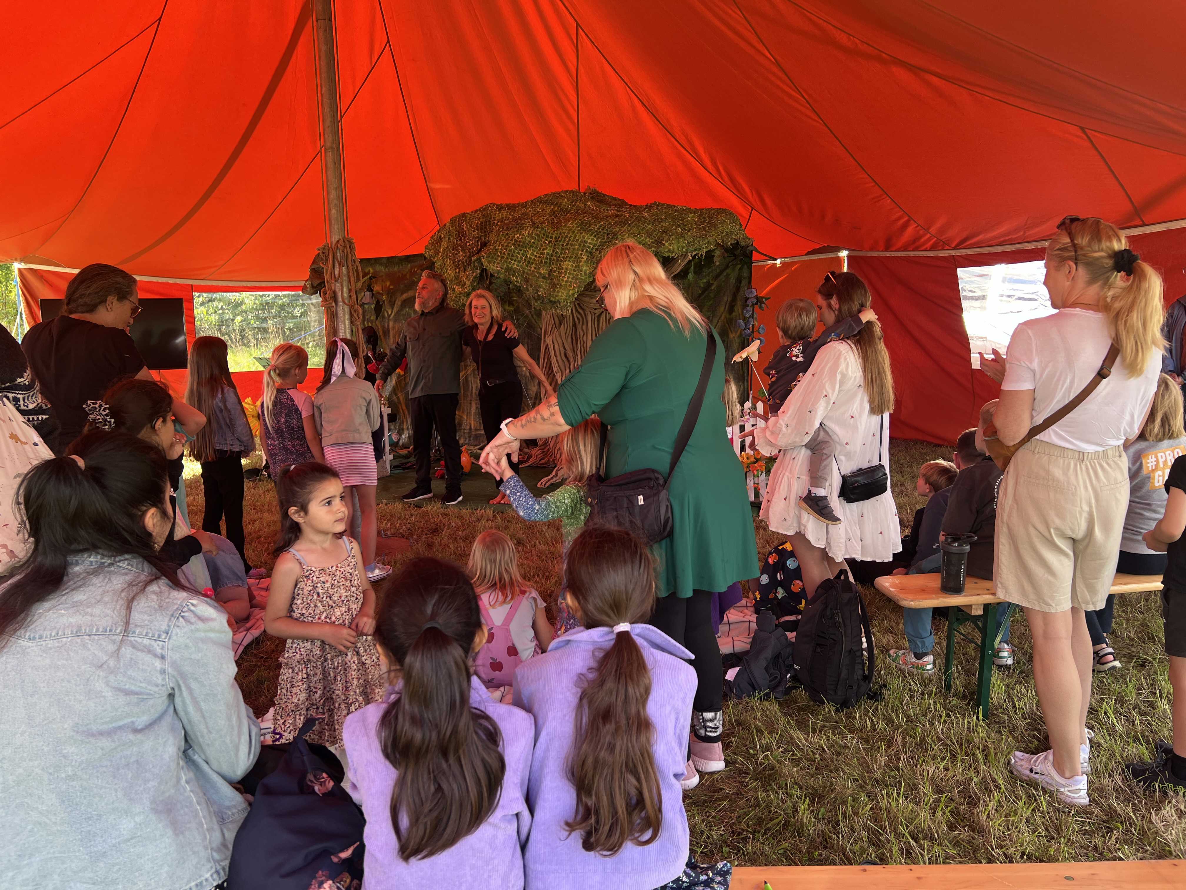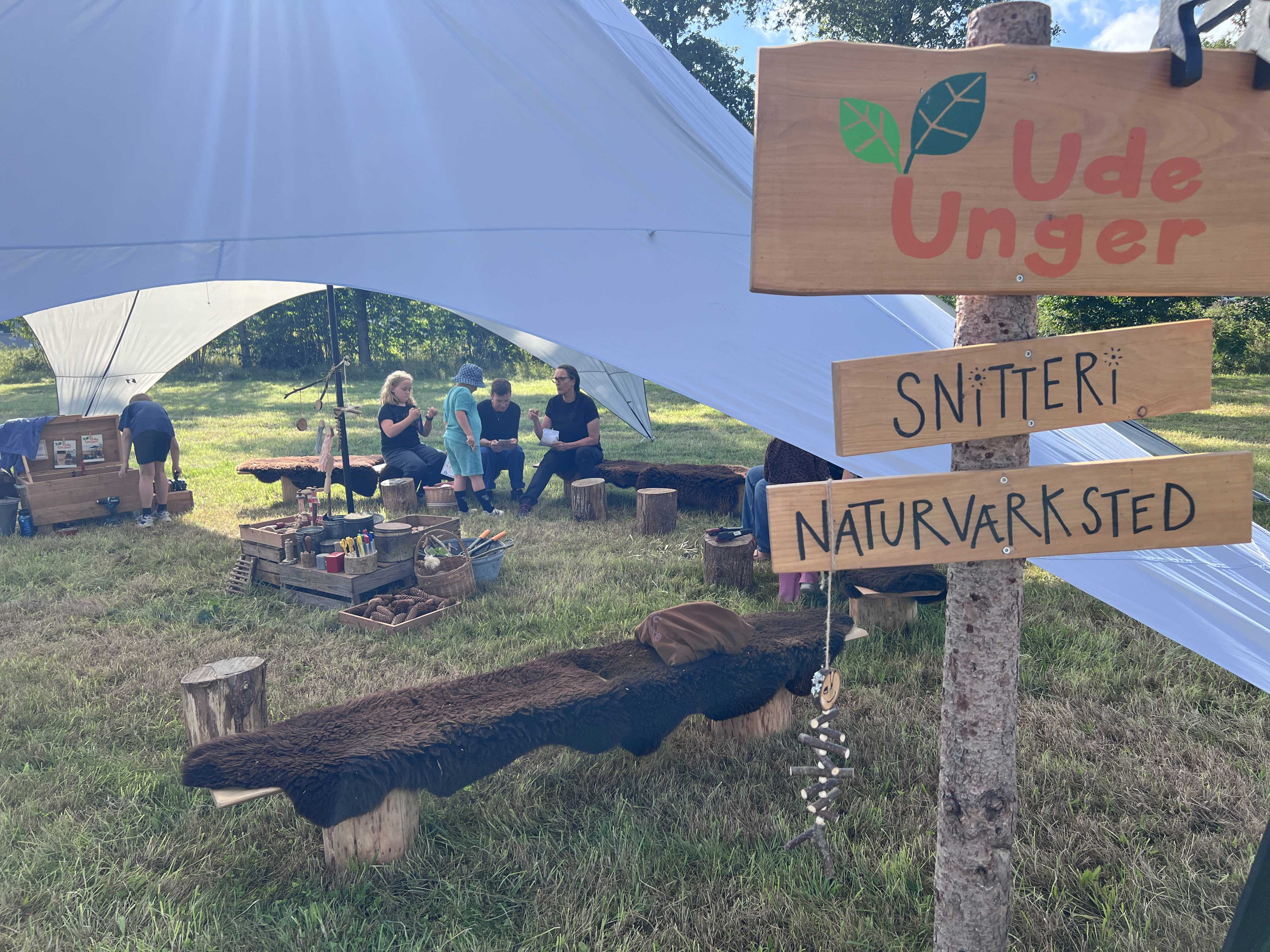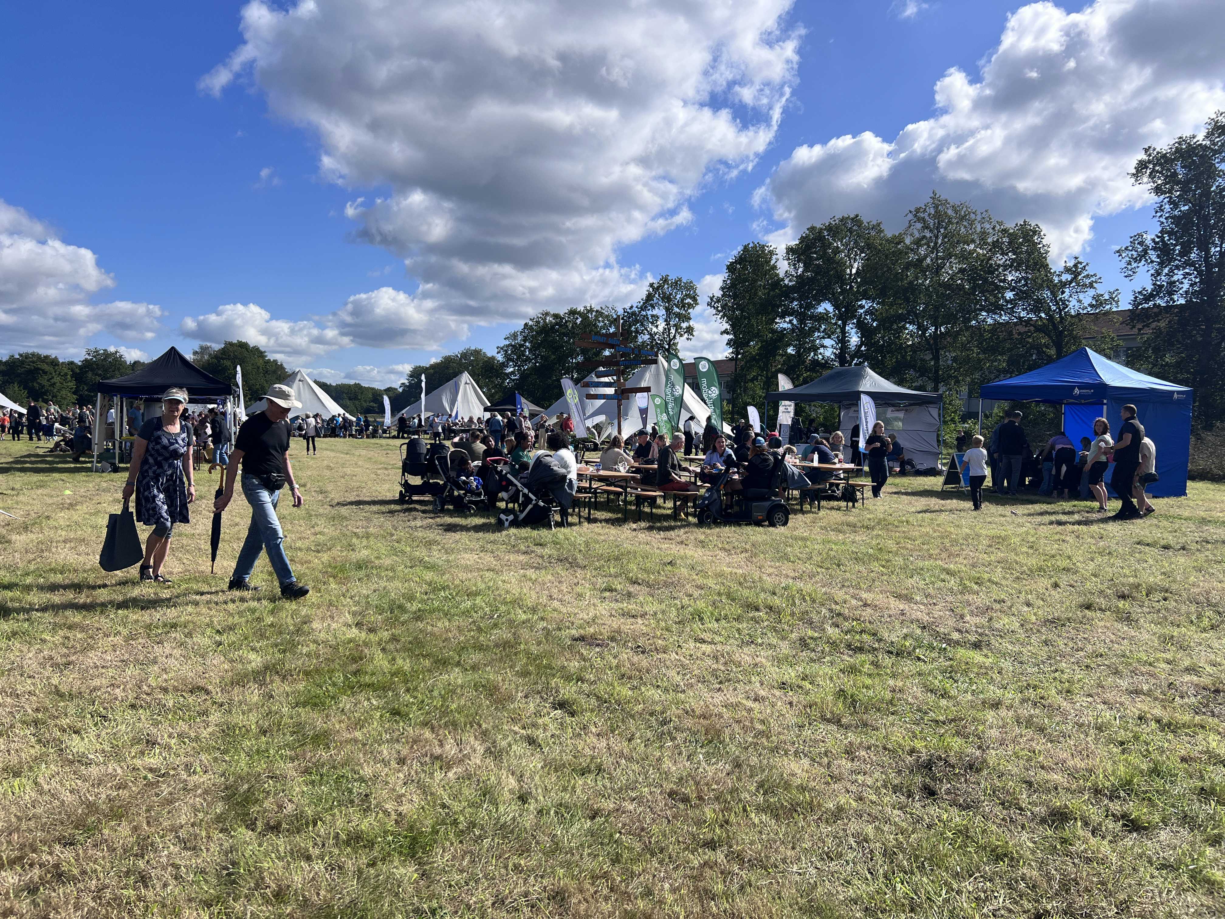 Naturfestival med græs, bål og telte.