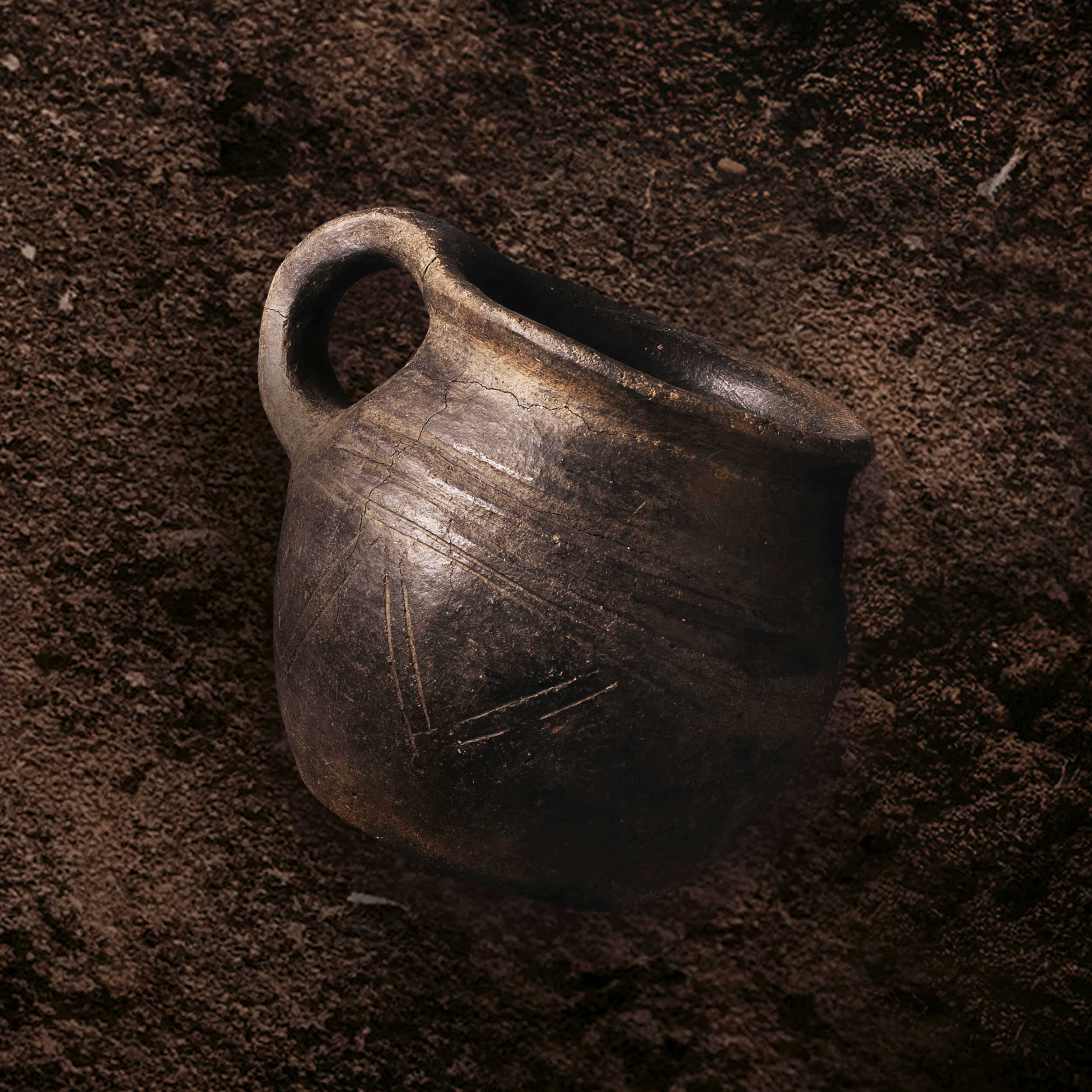 Velbevaret hankekop fra Virring øst for Randers. Hankens og randens udformning samt dekorationen viser, at lerkarret er fra ældre romersk jernalder (år 1-160).